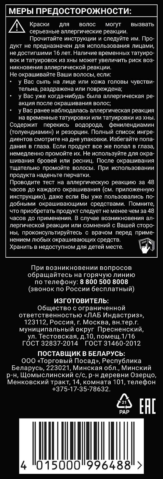 Содержит перекись водорода, фенилендиамин (толуендиамин) и резорцин. Полный список ингредиентов смотрите на дне упаковки. Избегайте попадания в глаза. Если продукт все же попал в глаза, немедленно промойте их. Не используйте для окрашивания бровей или ресниц. После окрашивания тщательно промойте волосы. При использовании продукта наденьте перчатки.