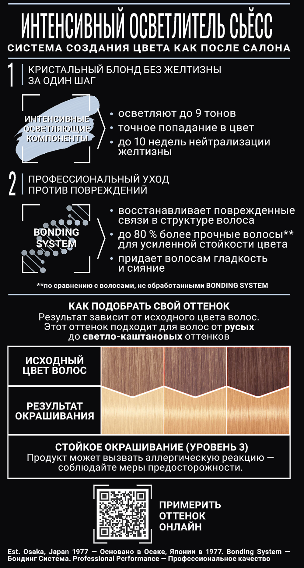 Стойкий осветлитель Сьёсс содержит интенсивные осветляющие компоненты для глубоких и многогранных оттенков и Bonding system для восстановления связей в структуре волоса. Теперь волосы До 80% более прочные благодаря профессиональному уходу*