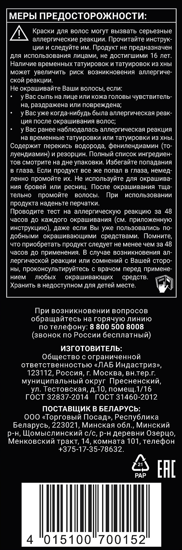 Содержит перекись водорода, фенилендиамин (толуендиамин) и резорцин. Полный список ингредиентов смотрите на дне упаковки. Избегайте попадания в глаза. Если продукт все же попал в глаза, немедленно промойте их. Не используйте для окрашивания бровей или ресниц. После окрашивания тщательно промойте волосы.