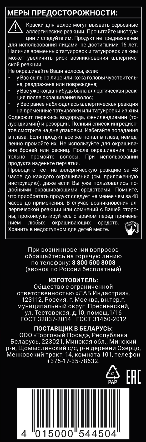 Содержит перекись водорода, фенилендиамин (толуендиамин) и резорцин. Полный список ингредиентов смотрите на дне упаковки. Избегайте попадания в глаза. Если продукт все же попал в глаза, немедленно промойте их. Не используйте для окрашивания бровей или ресниц. После окрашивания тщательно промойте волосы.