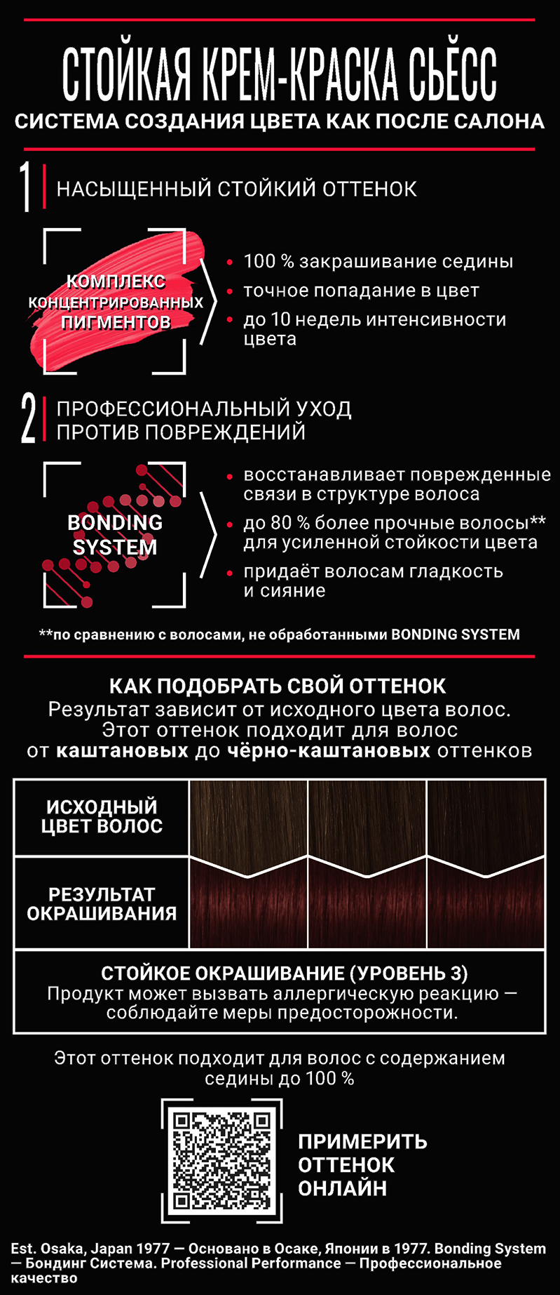 Стойкая крем-краска Сьёсс содержит ультра стойкие пигменты для глубоких и многогранных оттенков и Bonding system для восстановления связей в структуре волоса. Теперь волосы До 80% более прочные благодаря профессиональному уходу*