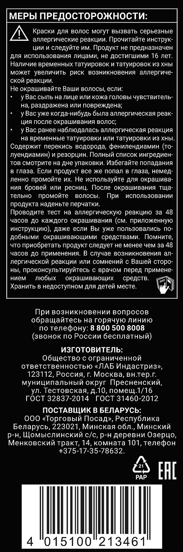Содержит перекись водорода, фенилендиамин (толуендиамин) и резорцин. Полный список ингредиентов смотрите на дне упаковки. Избегайте попадания в глаза. Если продукт все же попал в глаза, немедленно промойте их. Не используйте для окрашивания бровей или ресниц. После окрашивания тщательно промойте волосы.