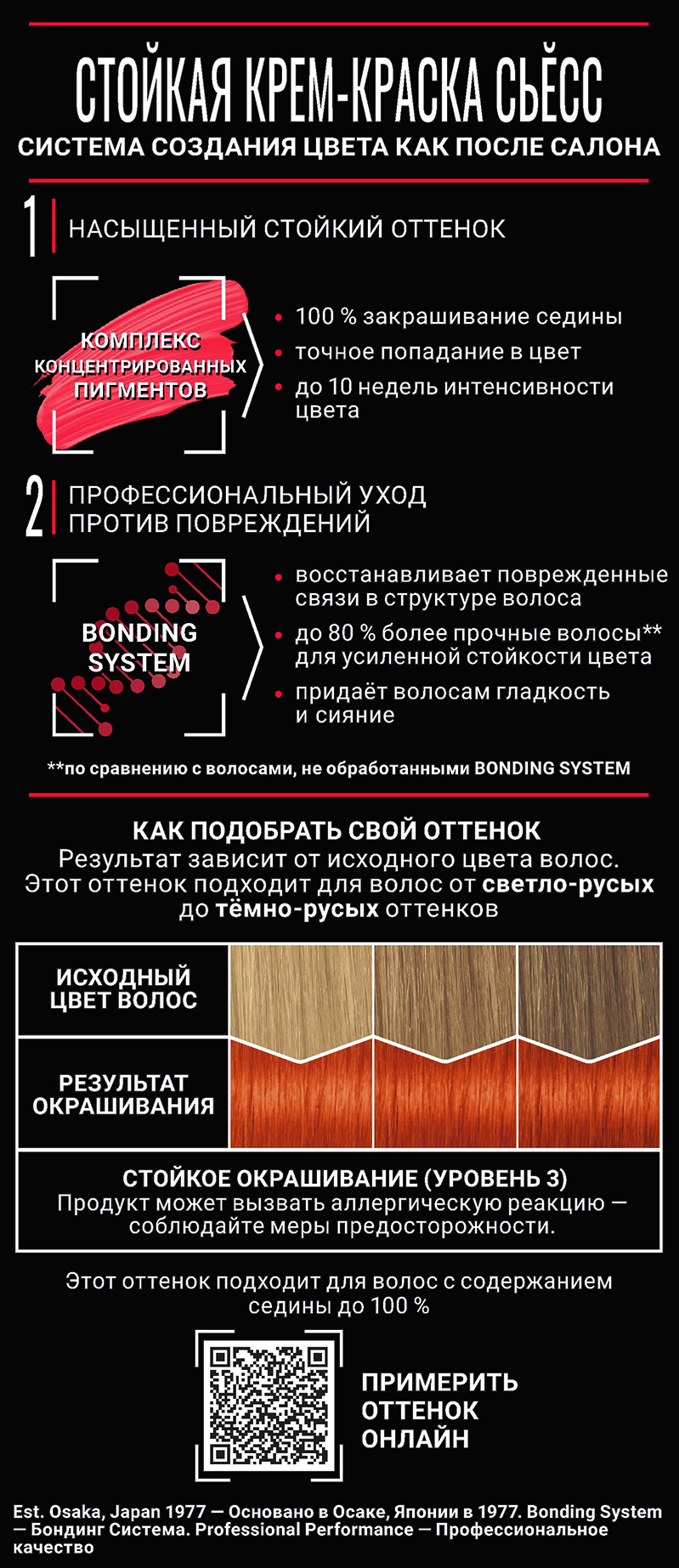 Стойкая крем-краска Сьёсс содержит ультра стойкие пигменты для глубоких и многогранных оттенков и Bonding system для восстановления связей в структуре волоса. Теперь волосы До 80% более прочные благодаря профессиональному уходу*
