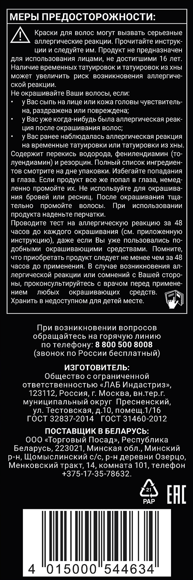 Содержит перекись водорода, фенилендиамин (толуендиамин) и резорцин. Полный список ингредиентов смотрите на дне упаковки. Избегайте попадания в глаза. Если продукт все же попал в глаза, немедленно промойте их. Не используйте для окрашивания бровей или ресниц. После окрашивания тщательно промойте волосы.