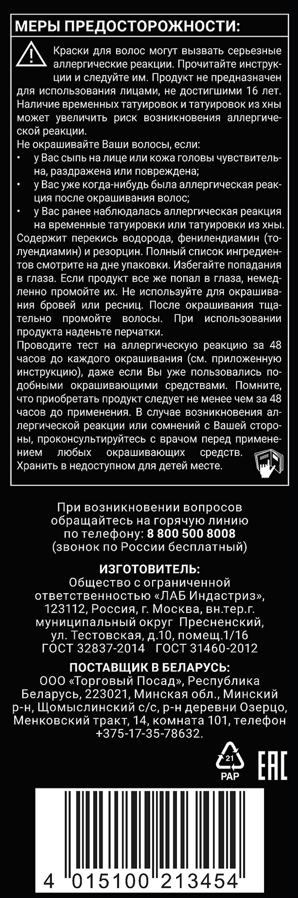 Содержит перекись водорода, фенилендиамин (толуендиамин) и резорцин. Полный список ингредиентов смотрите на дне упаковки. Избегайте попадания в глаза. Если продукт все же попал в глаза, немедленно промойте их. Не используйте для окрашивания бровей или ресниц. После окрашивания тщательно промойте волосы.