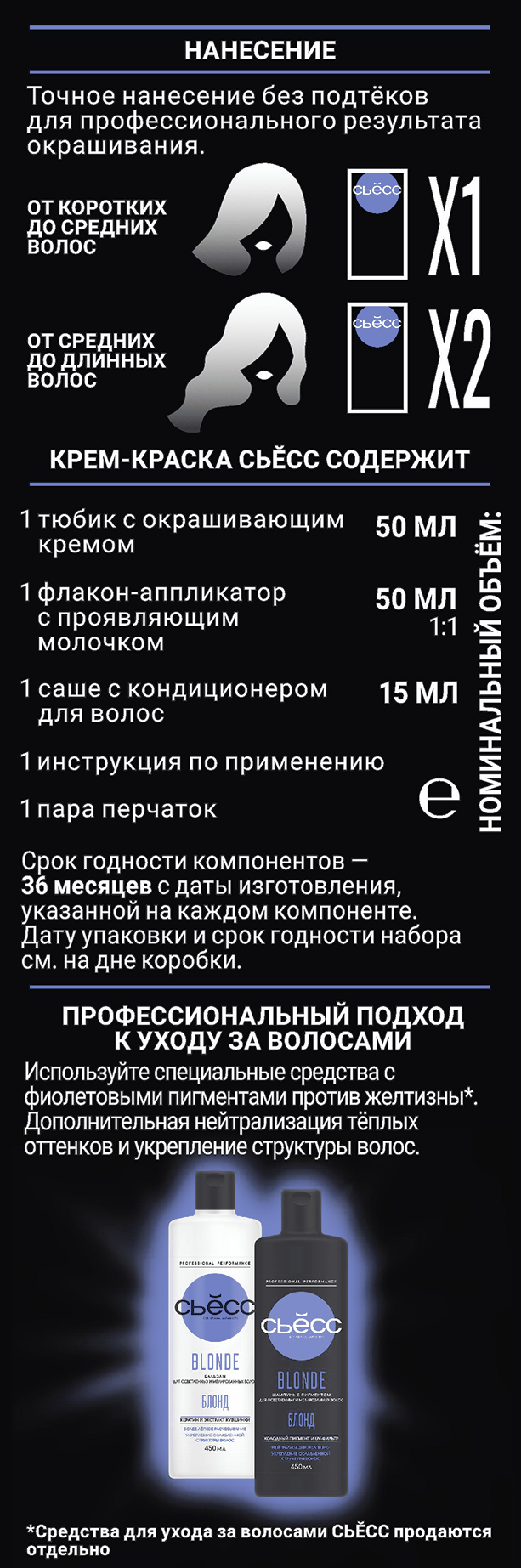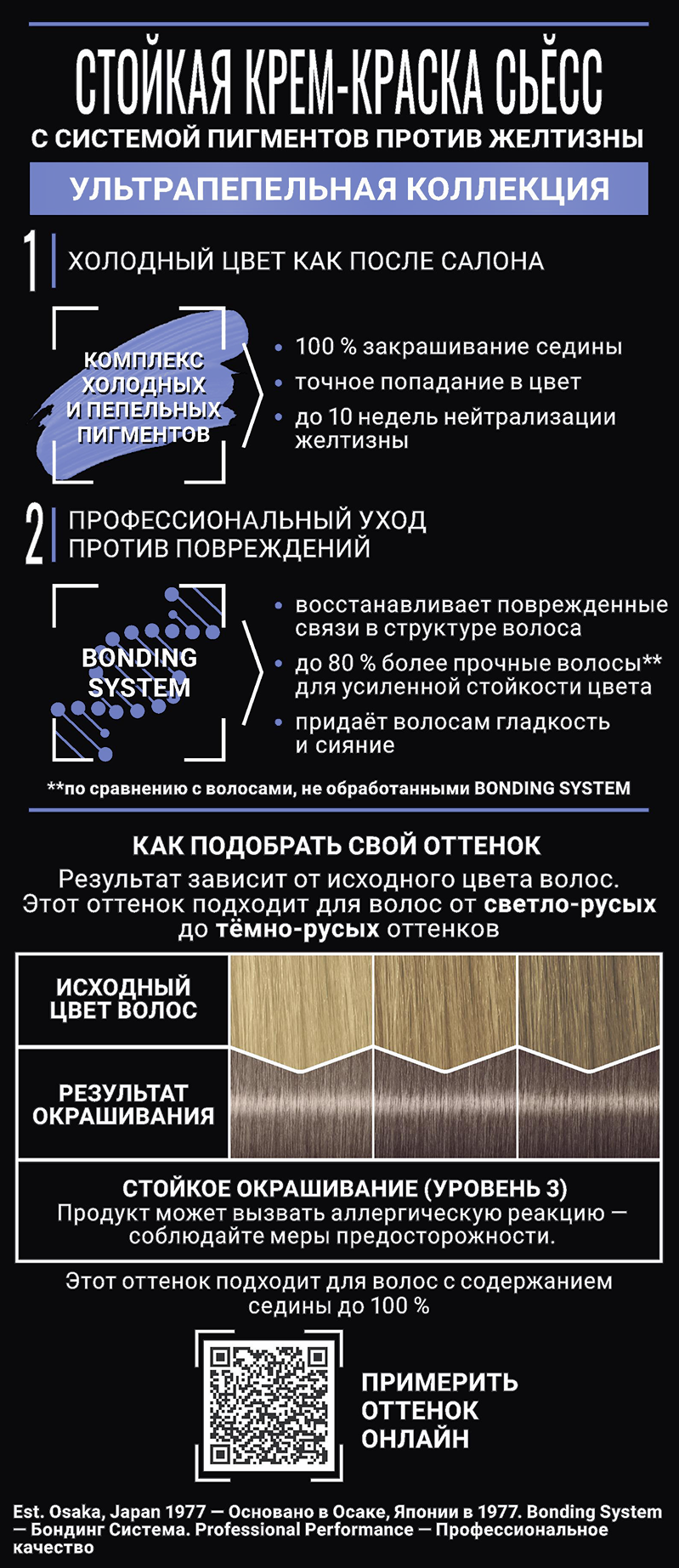 Стойкая крем-краска Сьёсс Ультрапепельная коллекция содержит комплекс холодных пигментов для глубоких и многогранных оттенков и Bonding system для восстановления связей в структуре волоса. Теперь волосы До 80% более прочные благодаря профессиональному уходу*