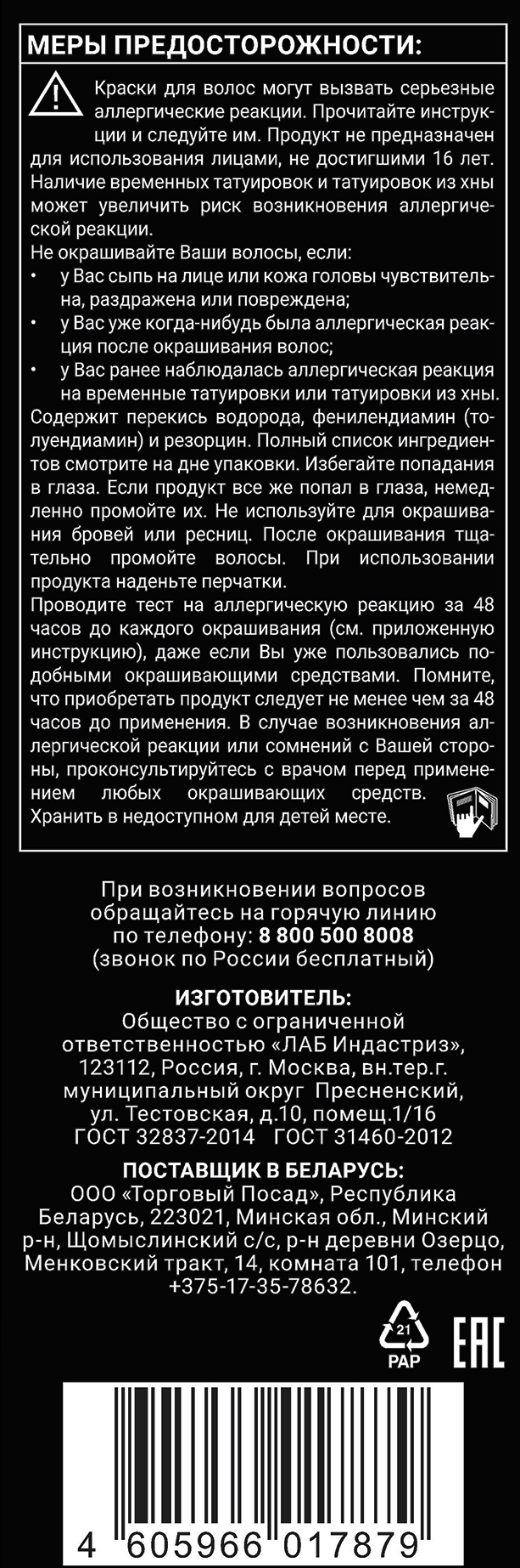 Содержит перекись водорода, фенилендиамин (толуендиамин) и резорцин. Полный список ингредиентов смотрите на дне упаковки. Избегайте попадания в глаза. Если продукт все же попал в глаза, немедленно промойте их. Не используйте для окрашивания бровей или ресниц. После окрашивания тщательно промойте волосы. При использовании продукта наденьте перчатки.